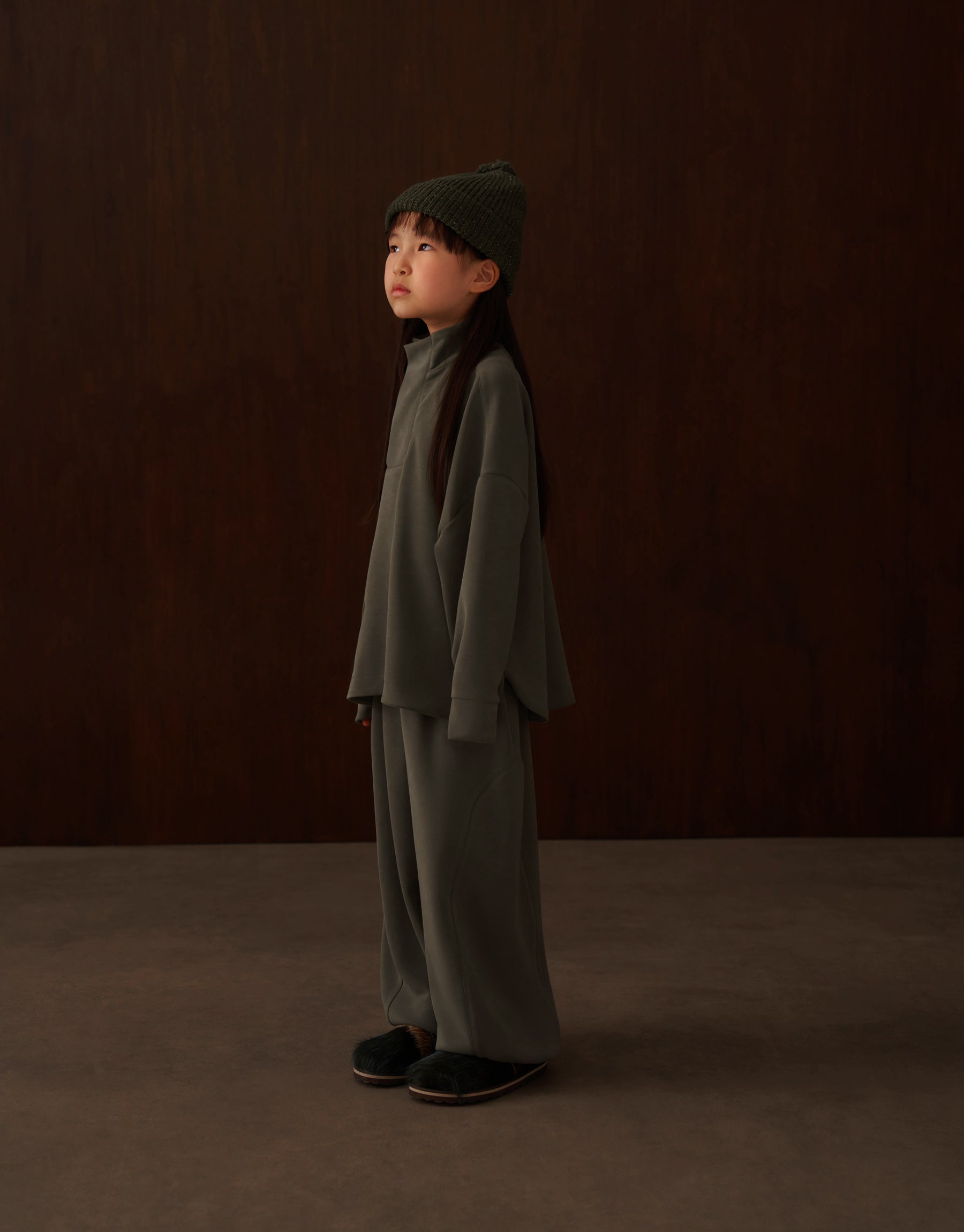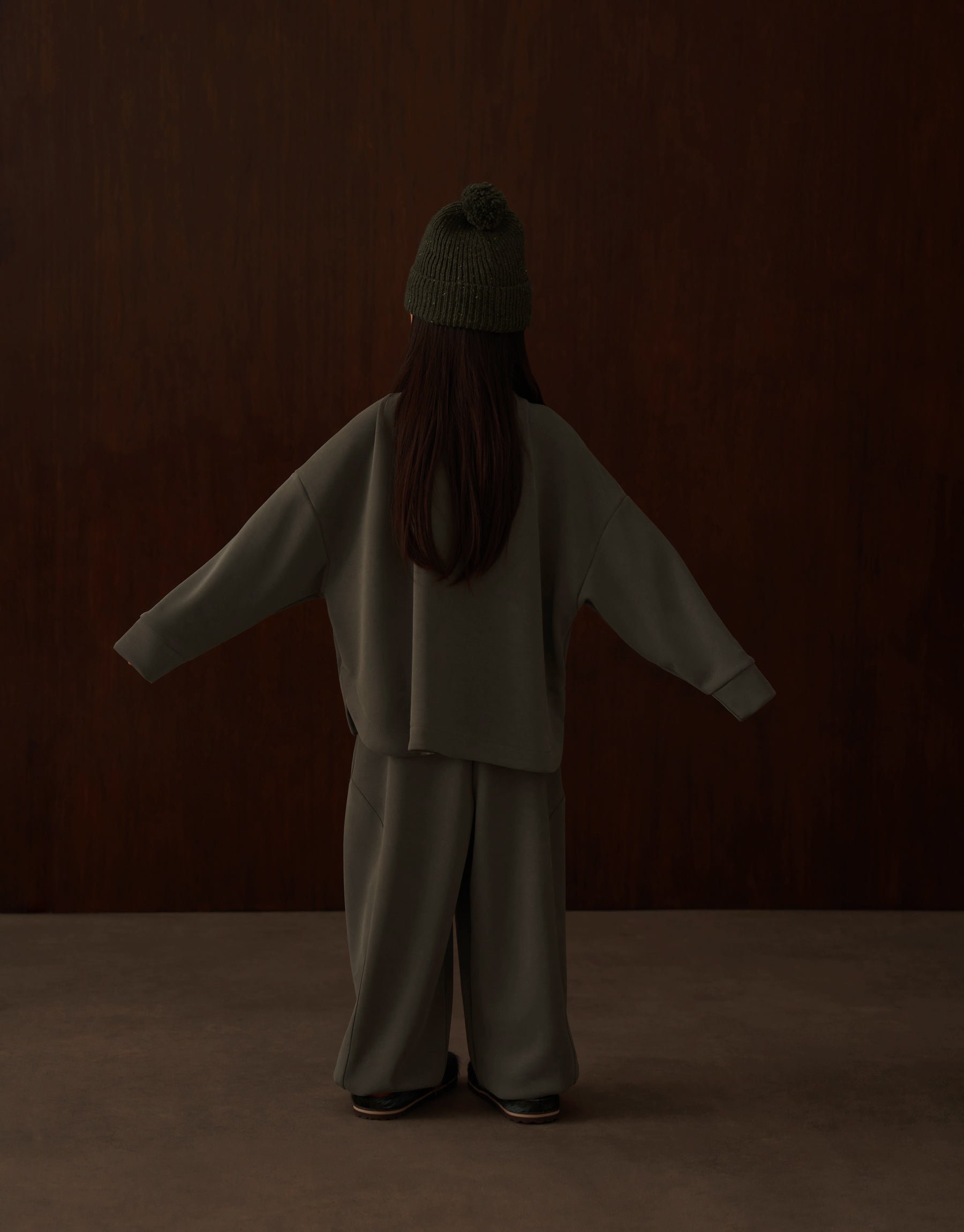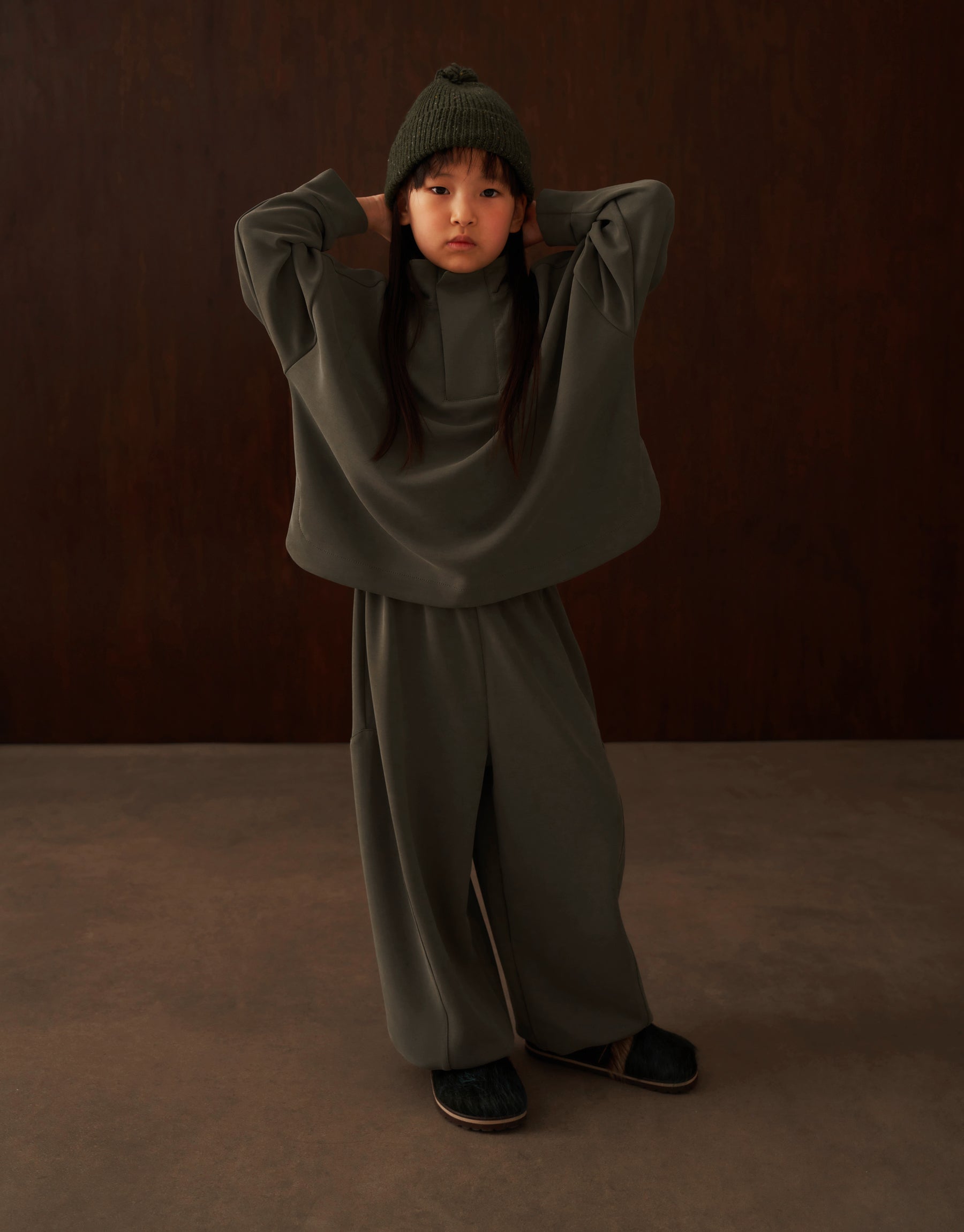 Modal kumaşın doğal yumuşaklığı ve ipeksi dokusu, konforlu bir his sağlamaktadır. Çıtçıtlı ve ön detaylı sweatshirt ve lastikli şalvar pantolon.