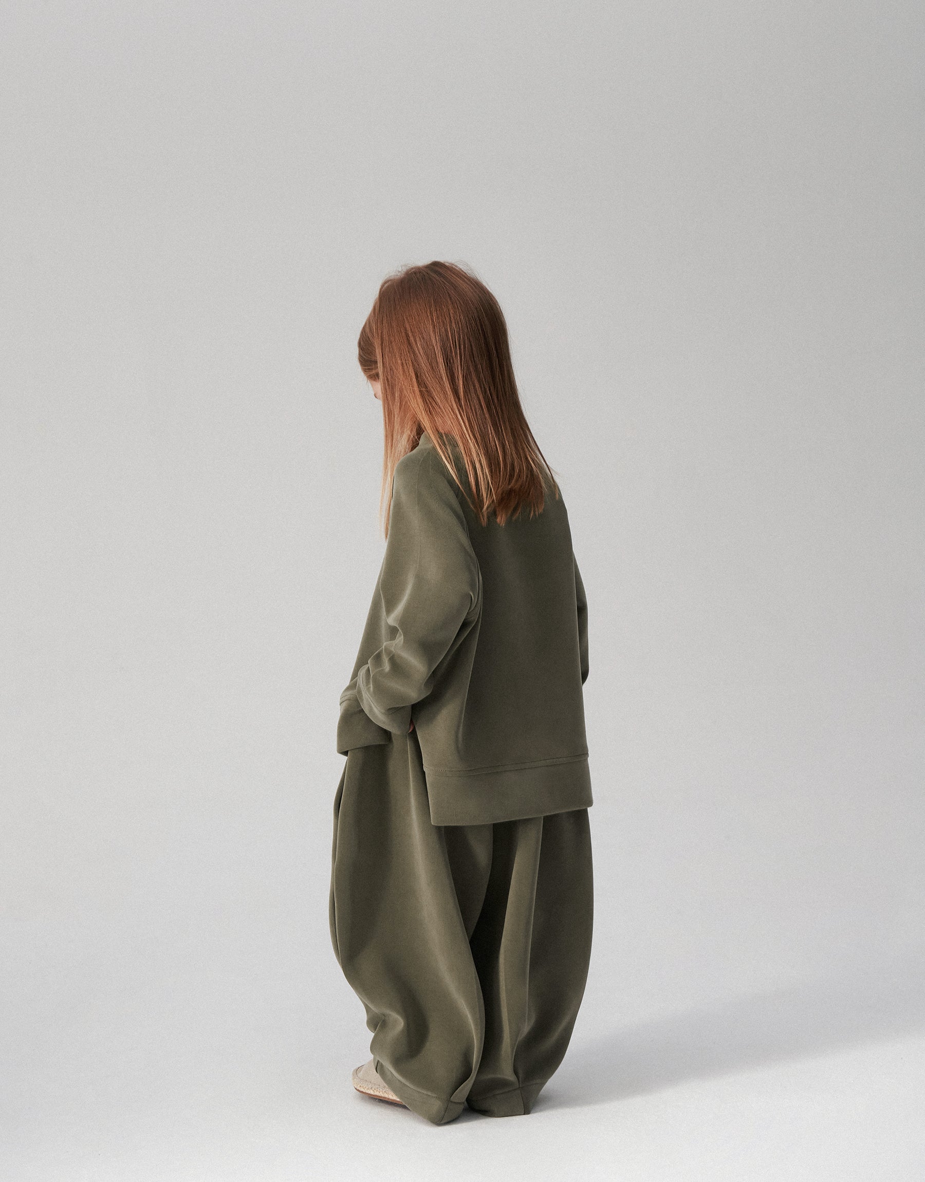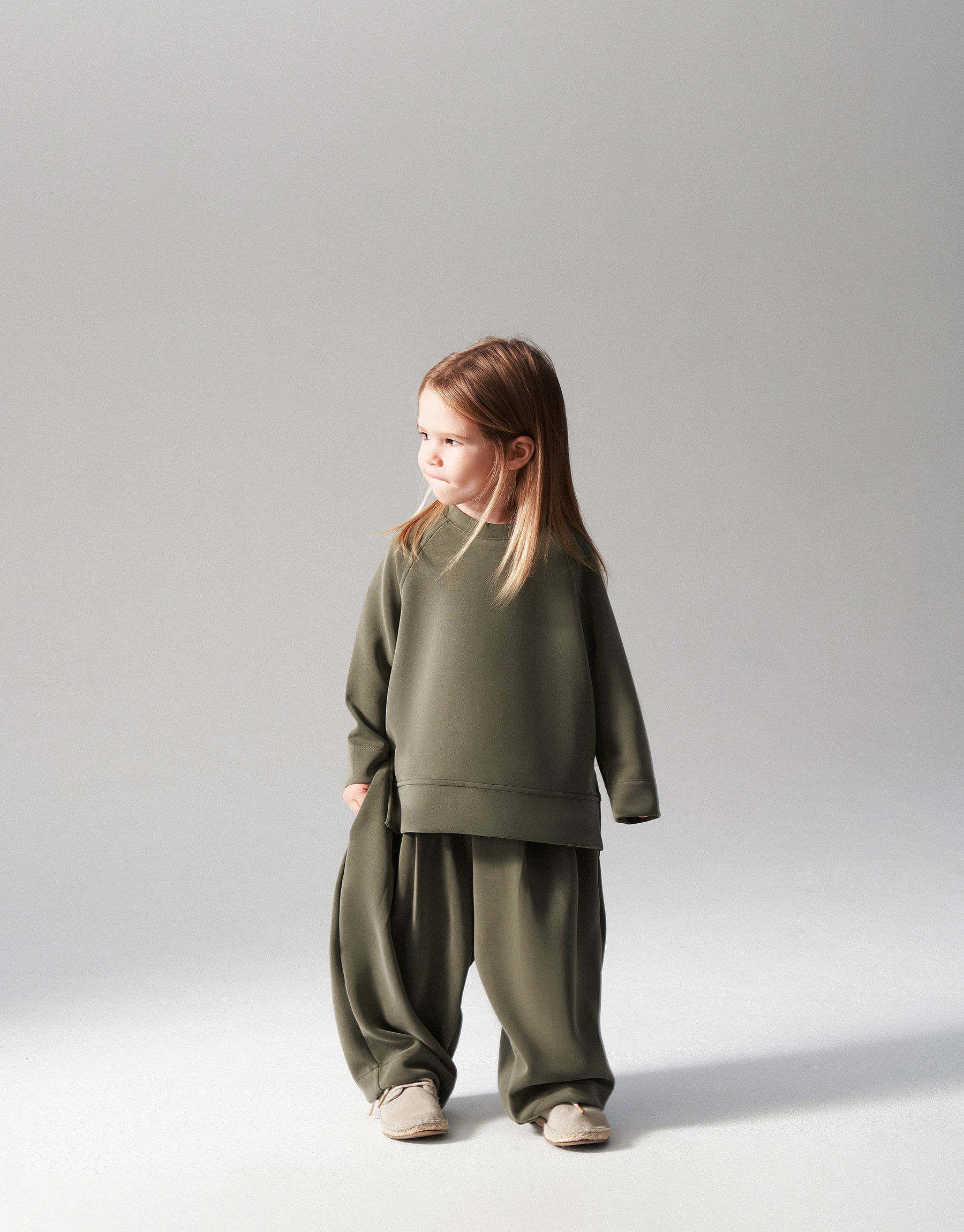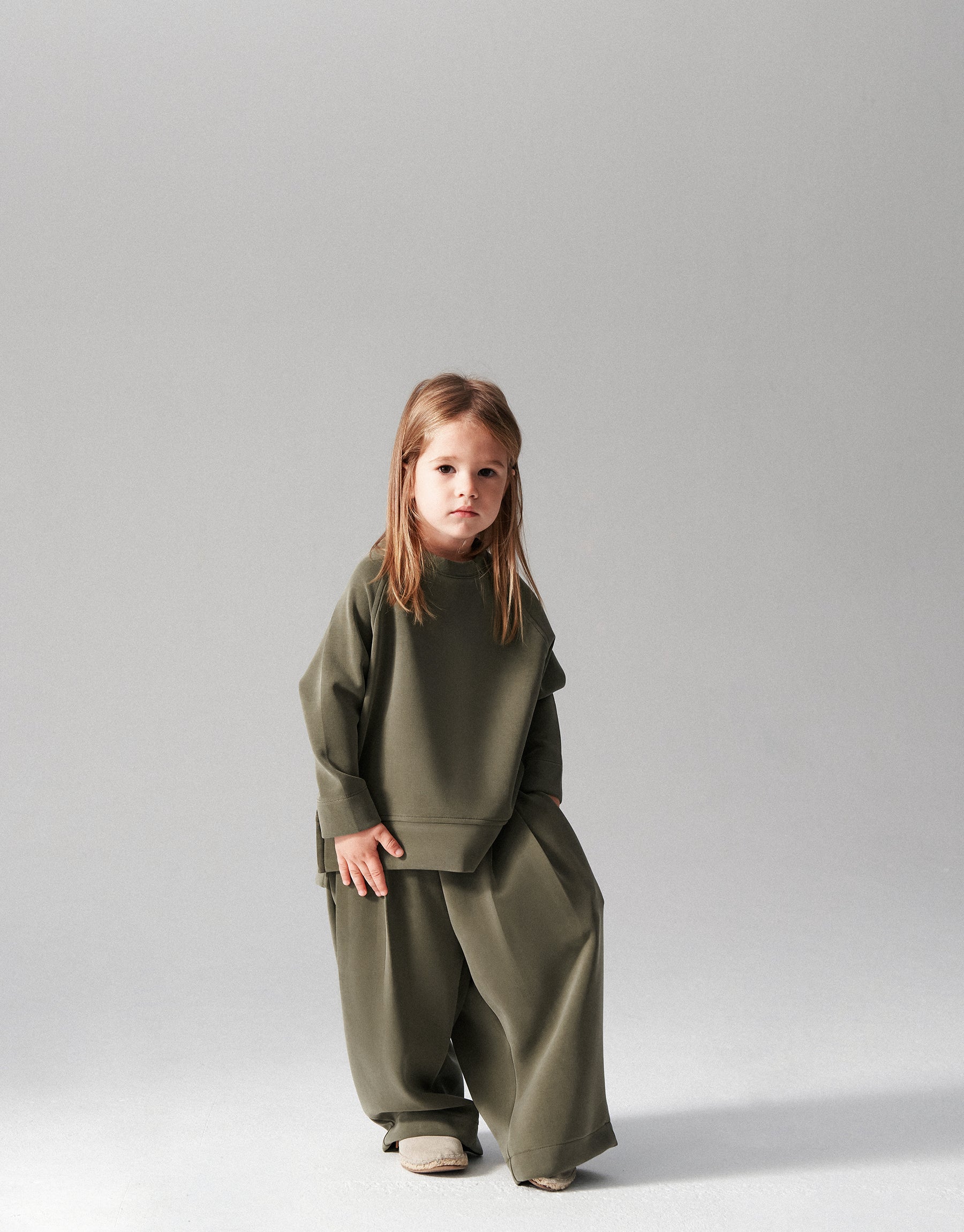 Modal kumaşın doğal yumuşaklığı ve ipeksi dokusu, konforlu bir his sağlamaktadır. Yandan yırtmaçlı, reglan kol tişört ve havuç pantolon.